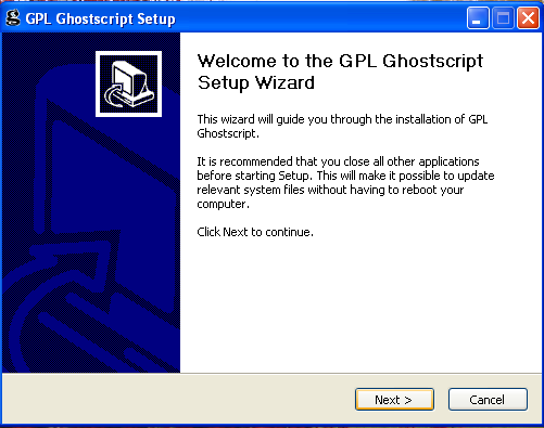 Запустіть на виконання файл gs904w32.exe або файл з аналогіною назвою, якщо номер версії більший за 9.04 — див. символи, виділені у назві підкресленням. З'явиться вікно, GPL Ghostscript Setup, у якому потрібно натиснути кнопку Next.
