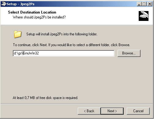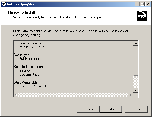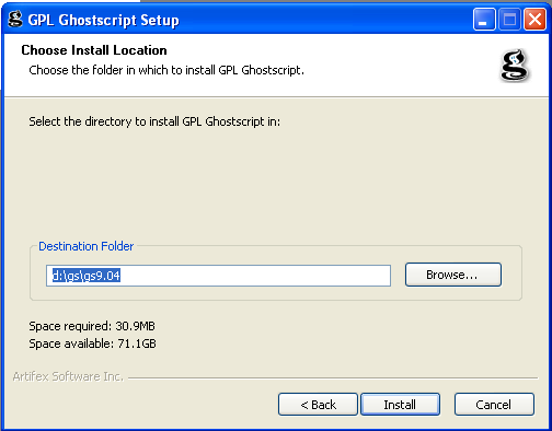 Далі у вікні GPL Ghostscript Setup потрібно вказати теку, куда буде встановлено програму. Можна залишити запропонований шлях, але для зменшення кількості символів змінної середовища PATH бажано вказати коротшу назву. Наприклад, d:\gs\gs9.04. Після цього потрібно натиснути кнопку Install для власне встановлення програми.