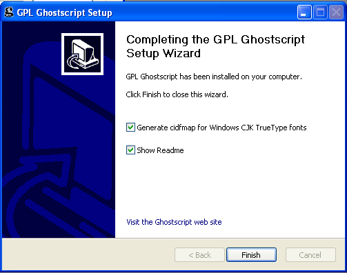В результаті Ghostscript буде встановлено. Для завершення процесу натисніть кнопку Finish вікна GPL Ghostscript Setup.