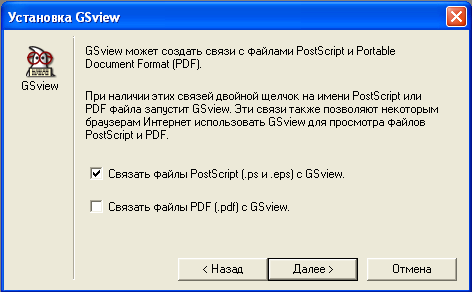 В останньому з поданих трьох вікон можна зв'язати GSview з pdf-файлами, виставивши відповідний прапорець.
