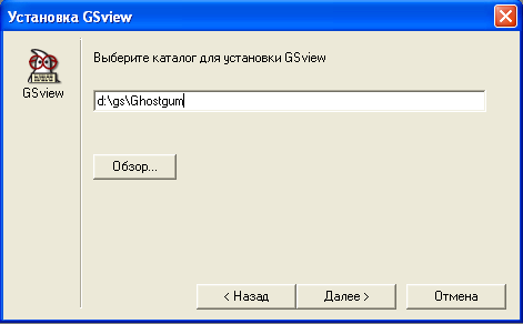 Далі у вікні Установка GSview потрібно вибрати теку для встановлення програми. Замість визначеної за замовчуванням вкажемо d:\gs і натиснемо Далее.