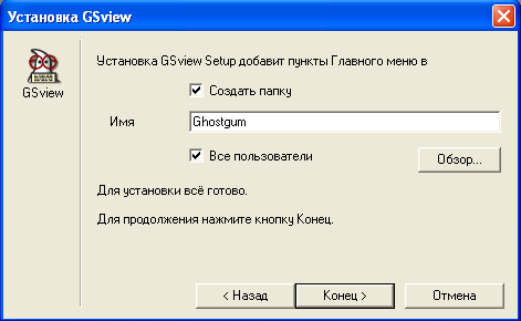 Далі у вікні Установка GSview з'явиться можливість вибору теки у меню програм для ярлика програми. Можемо залишити все без змін і натиснути кнопку Finish для завершення процесу встановлення.