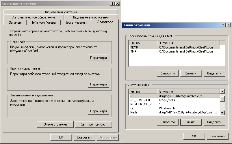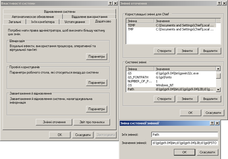 Cкориставшись вказівкою меню: Пуск / (Установка /) Панель керування / Система, перейдемо на закладку Змінні оточення і доповнимо початок означення змінної PATH такою послідовністю символів: