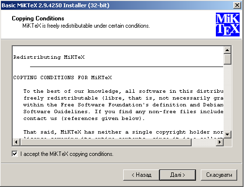 Запустіть програму basic-miktex-2.9.4250.exe. Відкриється вікно Basic MiKTeX-2.9.4250 Installer (32 bit), у якому Ви маєте ознайомитися з ліцензійною угодою (англійською мовою), погодитися з її положеннями й натиснути кнопку Далі.
