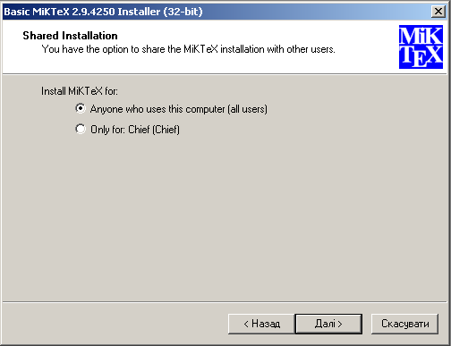 У вікні Basic MiKTeX-2.9.4250 Installer (32 bit) виберіть варіант встановлення MiKTeX для всіх користувачів і натисніть кнопку Далі.