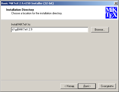 У вікні Basic MiKTeX-2.9.4250 Installer (32 bit) вкажіть шлях до теки встановлення d:\gs\MiKTeX 2.9 і натисніть кнопку Далі.