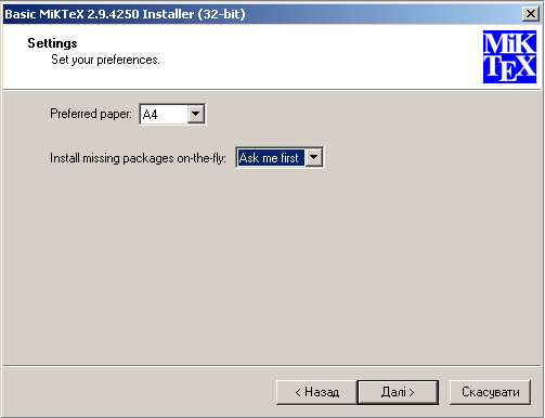 У вікні Basic MiKTeX-2.9.4250 Installer (32 bit) можна змінити формат паперу (A4 згідно із замовчуванням) та дії при встановленні нових пакетів MiKTeX (запит згідно із замовчуванням). Натисніть кнопку Далі.