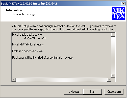 У вікні Basic MiKTeX-2.9.4250 Installer (32 bit) буде повідомлено про налаштування встановлення. Натисніть кнопку Start.