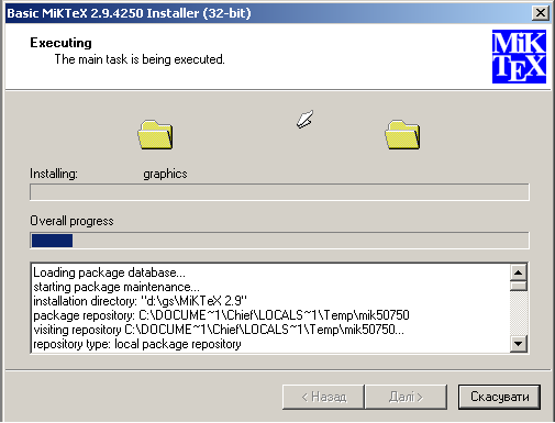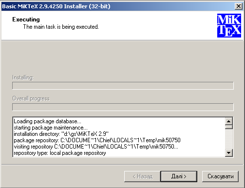 У вікні Basic MiKTeX-2.9.4250 Installer (32 bit) протягом кількох хвилин буде відображено процес встановлення. Не чіпайте нічого.