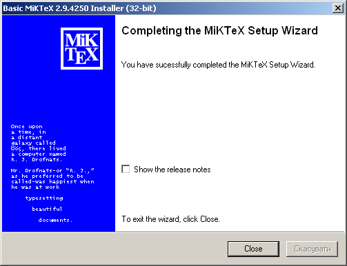 Натисніть кнопку Close у вікні Basic MiKTeX-2.9.4250 Installer (32 bit) для завершення процесу встановлення.