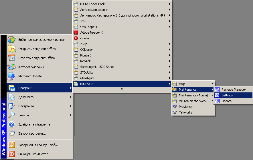 Скористайтеся вказівкою меню Пуск / Програми / MiKTeX 2.9 / Maintenance / Settings.