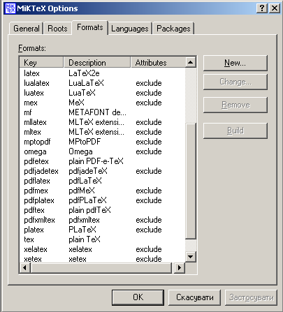 Рекомендують спочатку інших форматних файлов не створювати. Для під'єднання чи від'єднання форматних файлів потрібно відповідно встановити чи зняти для нього атрибут exclude (див. 3-ій стовпчик у цьому вікні). Після вибору форматних файлів натисніть кнопку Застосувати. Якщо ніякого додаткового вибору не здійснено, то і кнопку натискати не потрібно.