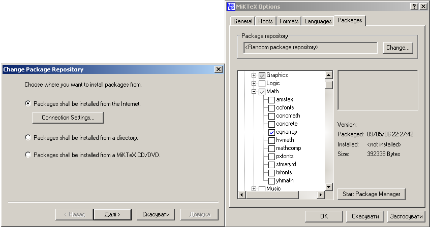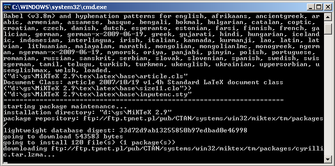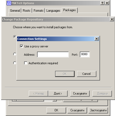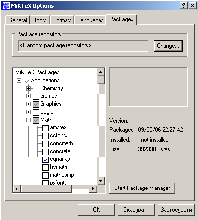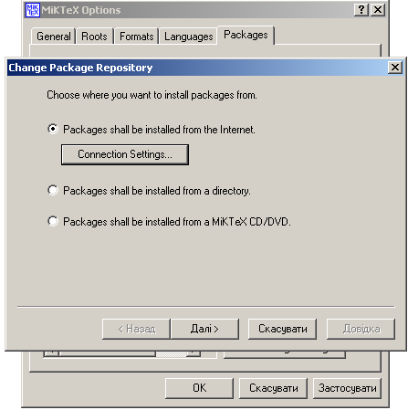 Звичайно, завантаження всіх пакетів можна здійснити, перебуваючи на закладці Packages вікна MiKTeX Options (див. вище). Але й такий спосіб завантаження пакетів «за фактом використання» користувачу бажано знати.
