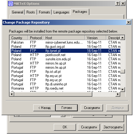 У вікні Change Package Repository, яке змінить вигляд, виберіть джерело (наприклад, з сусідньої Польщі) і надтисніть кнопку Готово.