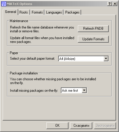 Перейдіть на закладку General і натисніть спочатку кнопку Refresh FNDB (для оновлення баз даних про теки і встановлені шрифти), а потім кнопку Update Formats (для створення заново форматних файлів). Для того, щоб у майбутньому не виникало проблем із завантаженням пакетів у процесі компіляції під керуванням, наприклад, TeXnic Center, потрібно вибрати Yes як відповідь на питання Install missing packages on-the-fly. Якщо не буде повідомлень щодо помилок, натисніть Ok у головному вікні.