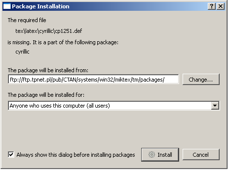 Якщо код містить звертання до ще невстановленого пакету (cp1251, amsfonts, srcltx тощо), то виникне вікно Package Installation, у якому потрібно натиснути кнопку Install для встановлення цього пакету.