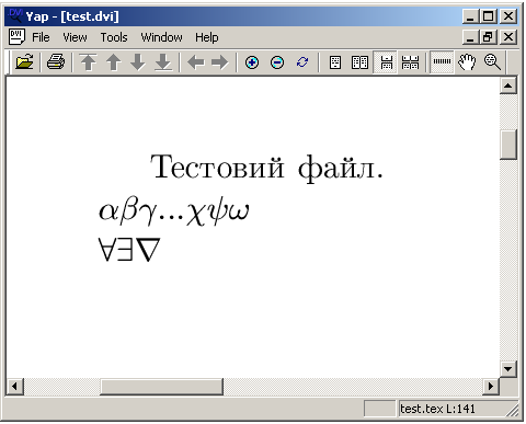 Після успішного виконання програми буде створено файл test.dvi, який можна переглянути за допомогою програми-переглядача Yap. Для цього достатньо набрати у рядку вказівок таке: yap test.dvi або скоритатися вказівкою меню: