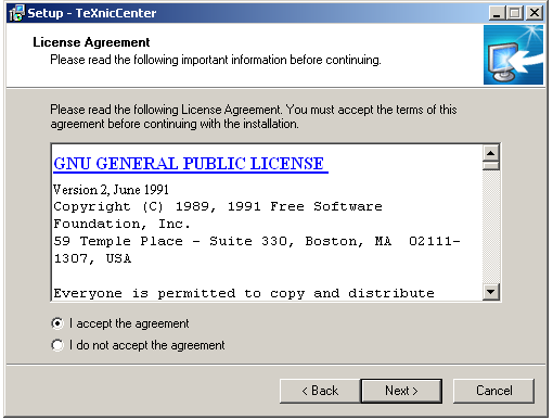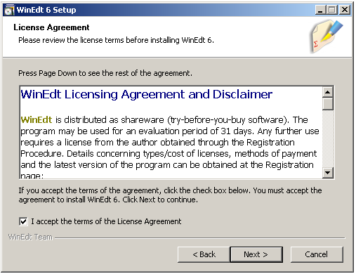 У наступному вікні буде подано ліцензійну угоду на використання програми. В ній сказано: програма WinEdt є shareware, через місяць після встановлення вона почне наполегливо (заважатиме нормальній роботі — примітка О.Р.) попереджувати про необхідність реєстрації. Прочинайте її, поставте прапорець щодо погодження з нею і натисніть Next.