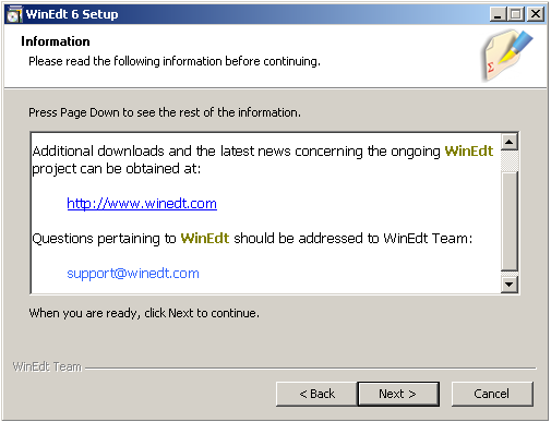 Ознайомтеся у новому вікні з адресою сайту, присвяченому проекту WinEdt та запишіть адресу, за якою можна звернутися (англійською мовою) за підтримкою, і натисніть кнопку Next.