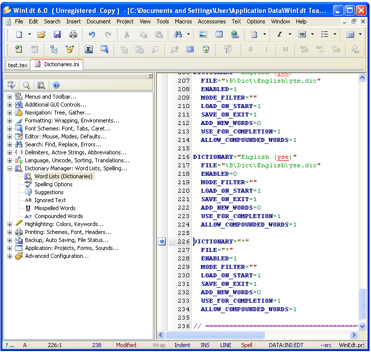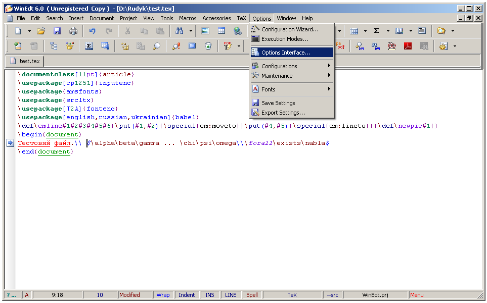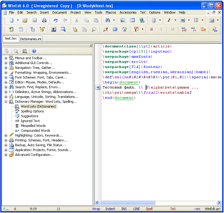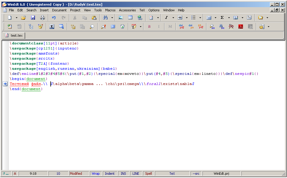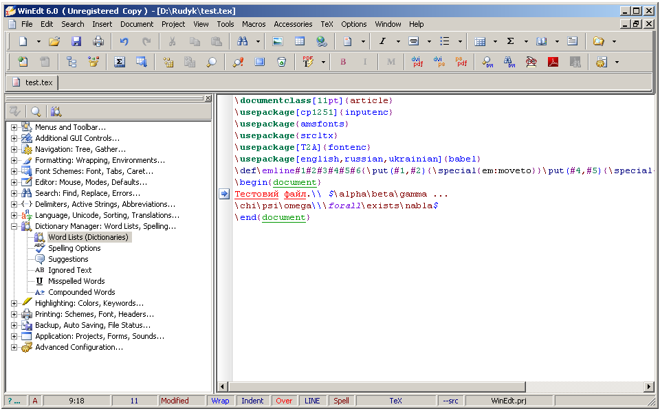 Завантажте згаданий раніше файл test.tex редактором WinEdt. Червоний колір і підкреслення тексту: «Тестовий файл» свідчать про те, що відповідних слів немає у переліку допустимих.