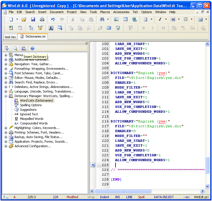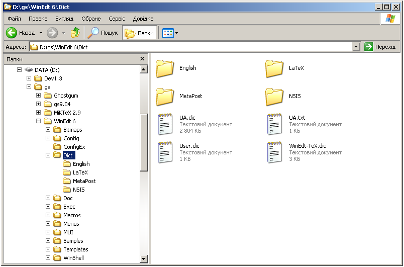 Розгорніть завантажені словники (zip-архіви, наприклад UA.dic і UA.txt) у теці d:\gs\WinEdt 6\Dict .