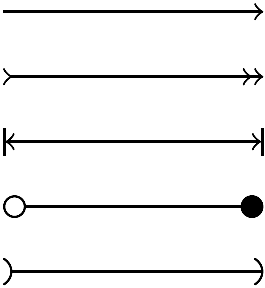 \draw[->] (0,0) -- (2,0); \draw[>->>] (0,-.5) -- (2,-.5); \draw[|<->|] (0,-1) -- (2,-1); \draw[o-*] (0,-1.5) -- (2,-1.5); \draw[)-)] (0,-2) -- (2,-2);