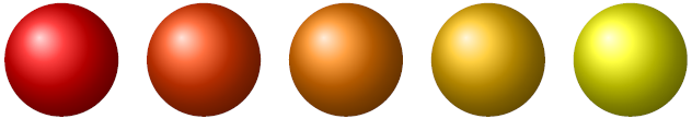 \foreach \x in {0,25,...,100} \shade[ball color=yellow!\x !red] ($0.04*(\x ,0)$) circle (4mm);