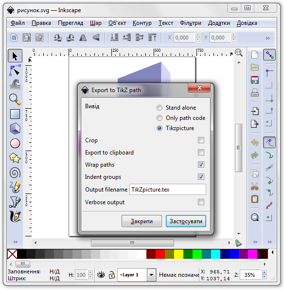 вказати назву файлу, у який буде здійснено виведення. Наприклад, Tikzpicture.tex. Цей файл буде розташовано у вже згаданій теці розширень. Природньо, для успішного здійснення експорту потрібно передбачити право на запис у цю теку;